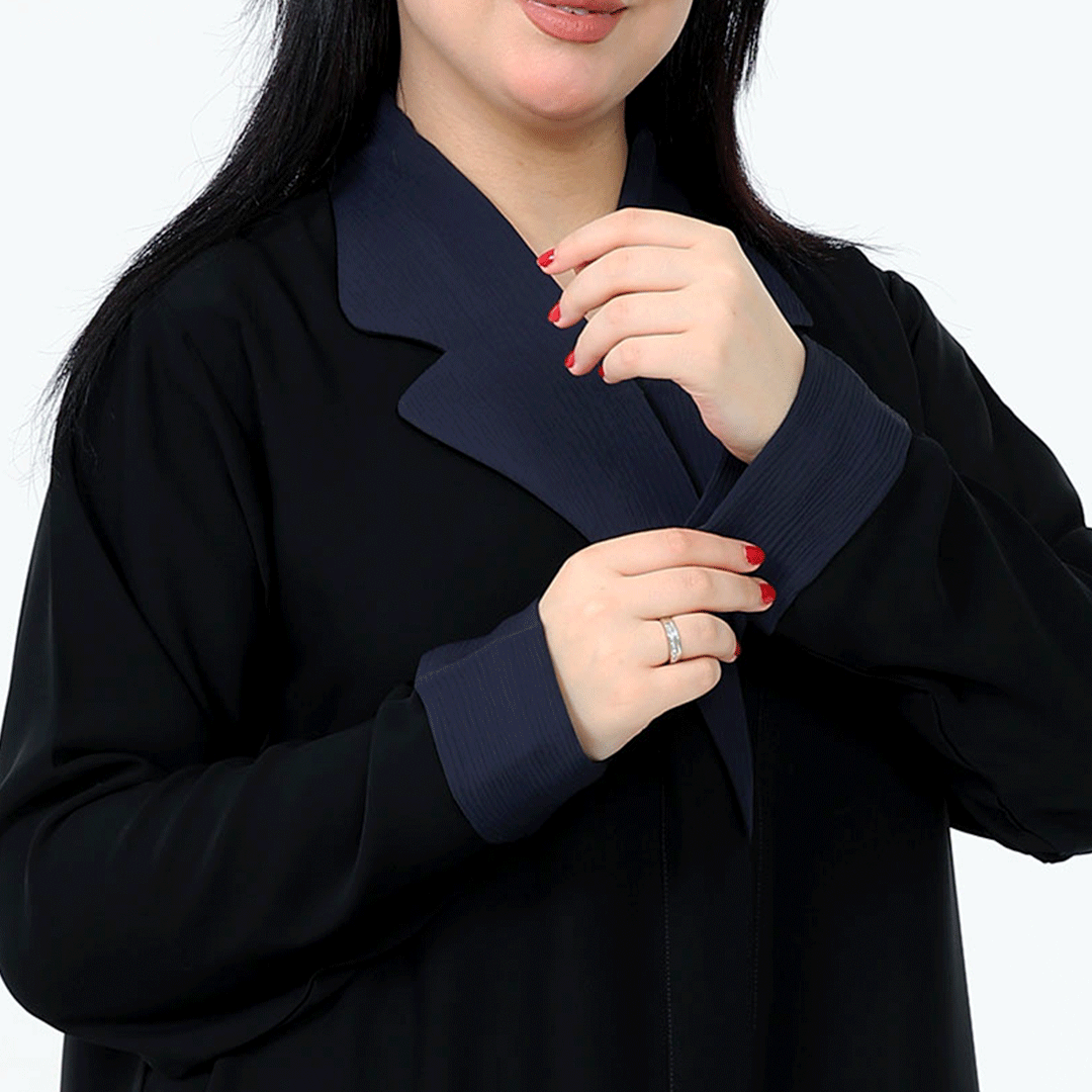 موديل ناعم مقفلة بطقطق مخفي لون الموديل بالصدر والأكمام كحلي الخامة عملية لا تحتاج للكوي ومعها طرحة متناسقه مع الموديل مقاس مترين 70x سم تقريبا بخامة الشيفون