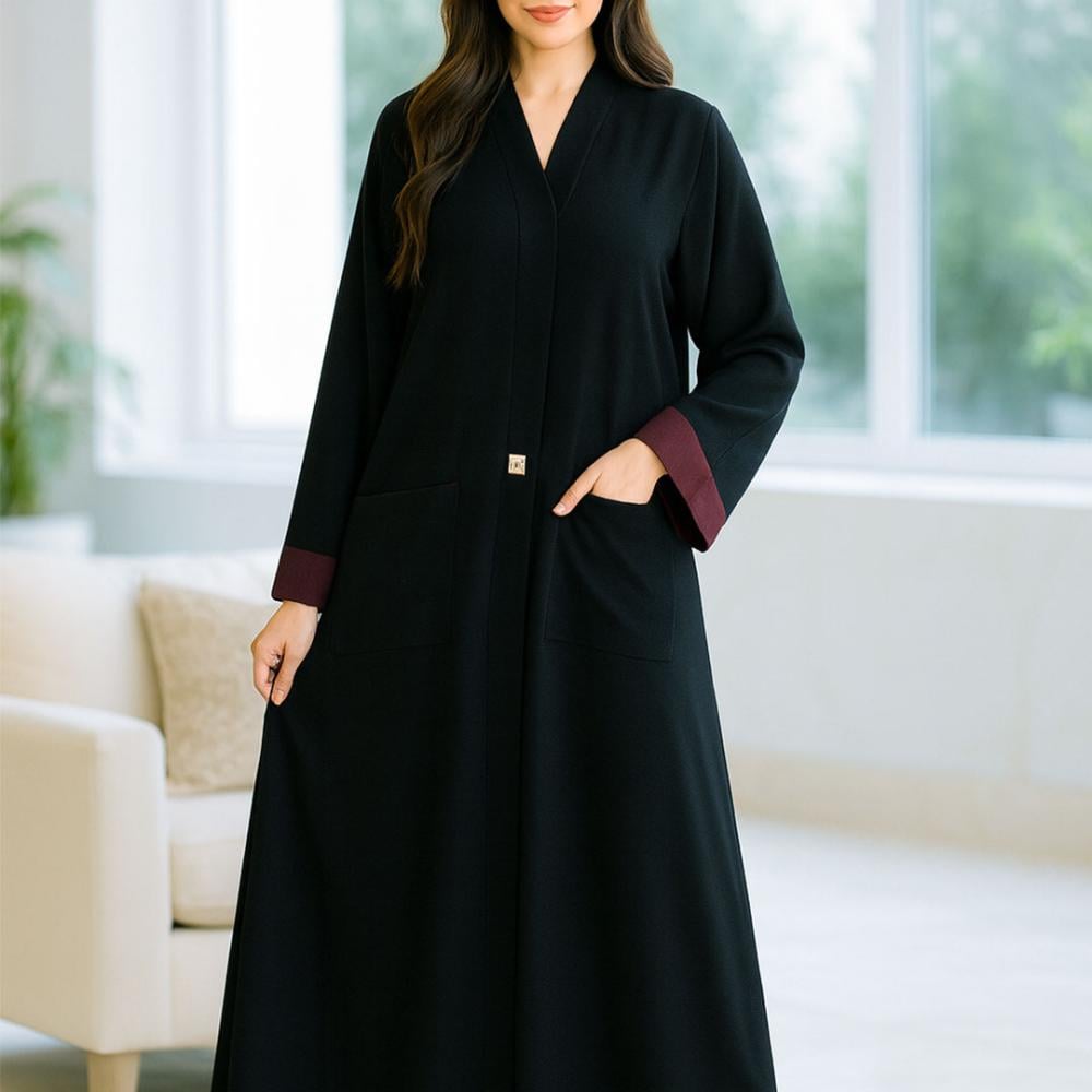 خامة باردة ولا تحتاج كوي والعباية معها طرحة بلون اسود واطرافها بلون الموديل مقاس مترين 70x سم تقريبا بخامة الشيفون