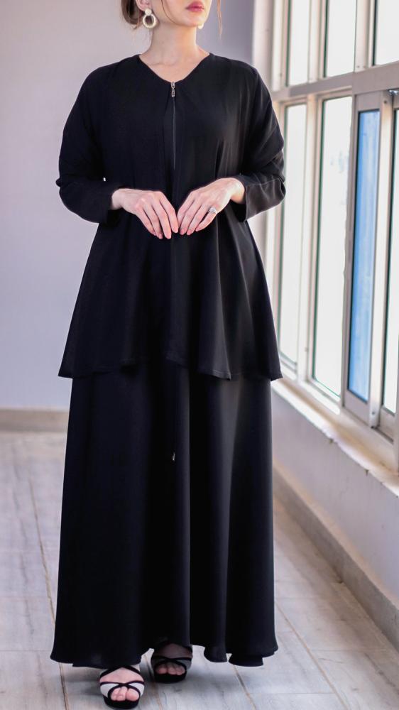 العباية من الاسفل كلوش ومعها طرحة بلون اسود سادة مقاس مترين 70x سم تقريبا بخامة الشيفون