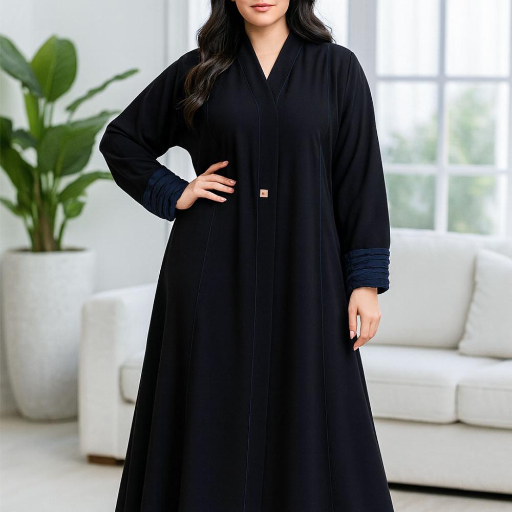 موديل ناعم وعملي ولا تحتاج للكوي لون الموديل كحلي يعطي نعومة للعباية ومعها طرحة بلون اسود واطرافها بلون الموديل مقاس مترين 70x سم تقريبا بخامة الشيفون