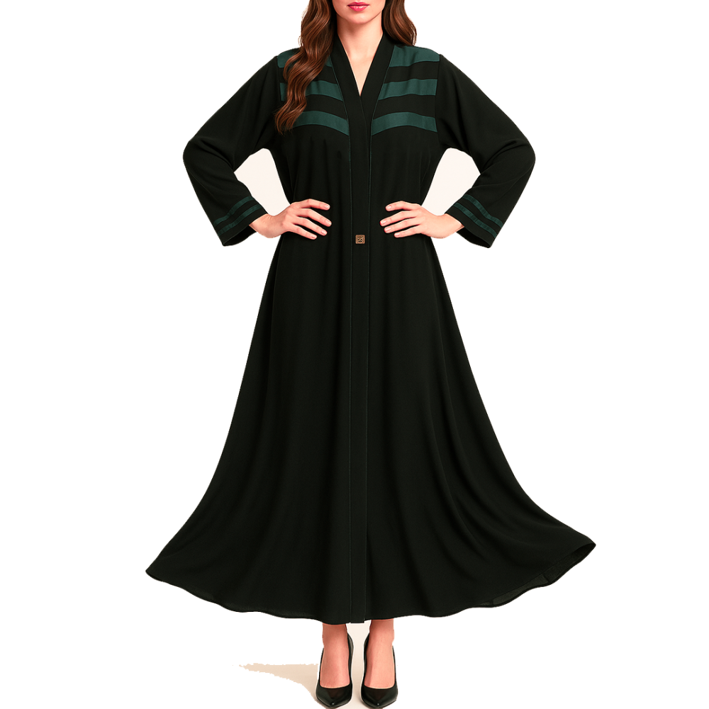 خامة ناعمة باردو ولا تحتاج كوي تناسب الاستخدام اليومي العباية من الخلف سادة و معها طرحة بلون اسود واطرافها متناسقة مع العباية مقاس مترين 70x سم تقريبا بخامة الشيفون