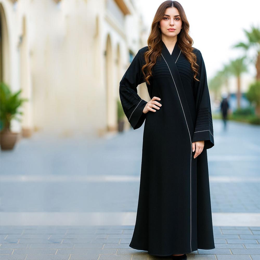 العباية من الخلف سادة الخامة ناعمة وباردة ولا تحتاج كوي ومعها طرحة بلون الاسود واطرافها بلون موديل العباية مقاس مترين 70x سم تقريبا بخامة الشيفون