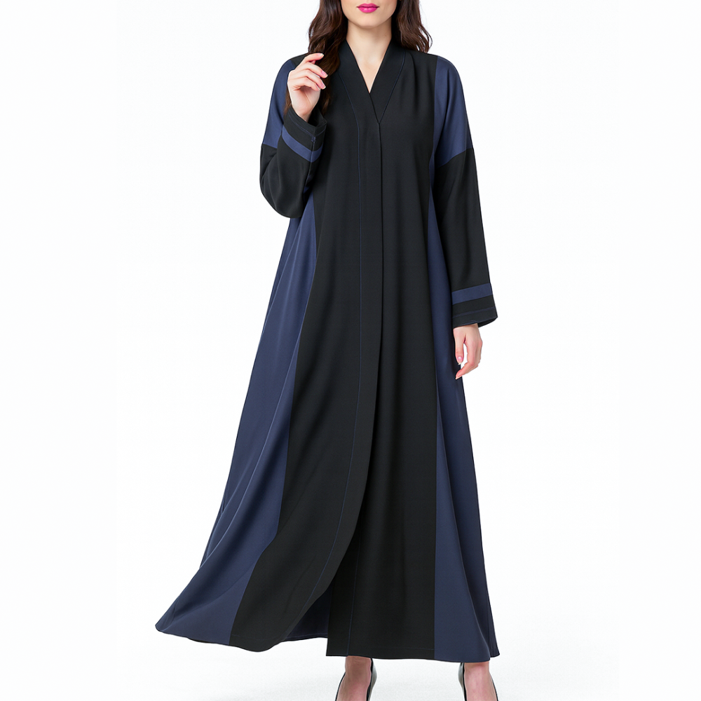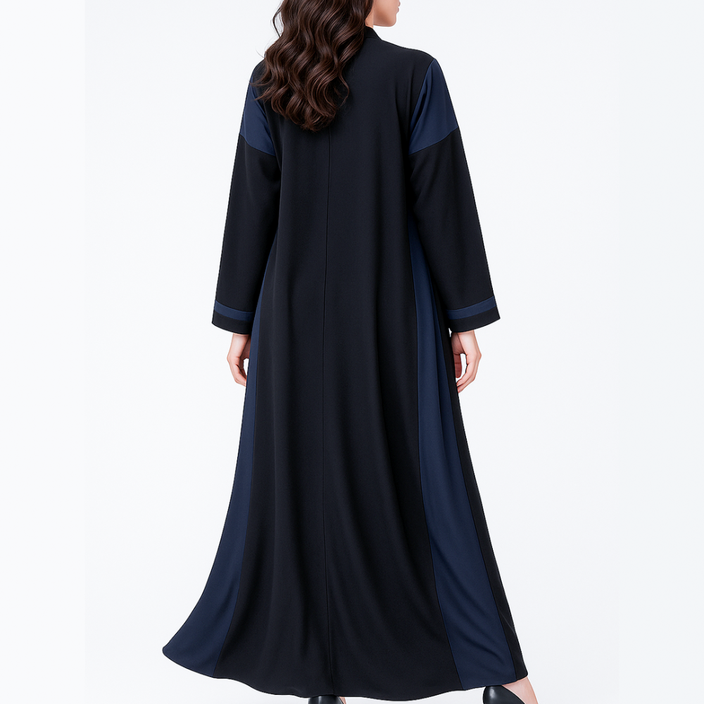 العباية من الخلف نفس الامام المنتصف اسود الاطراف كحلي ومعها طرحة بلون الاسود واطرافها بلون موديل العباية مقاس مترين 70x سم تقريبا بخامة الشيفون