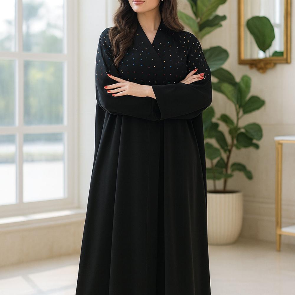 خامة عملية لا تحتاج للكوي وسوادها ممتاز موديل ناعم عملية ومعها طرحة متناسقة مع موديل العباية مقاس مترين 70x سم تقريبا بخامة الشيفون