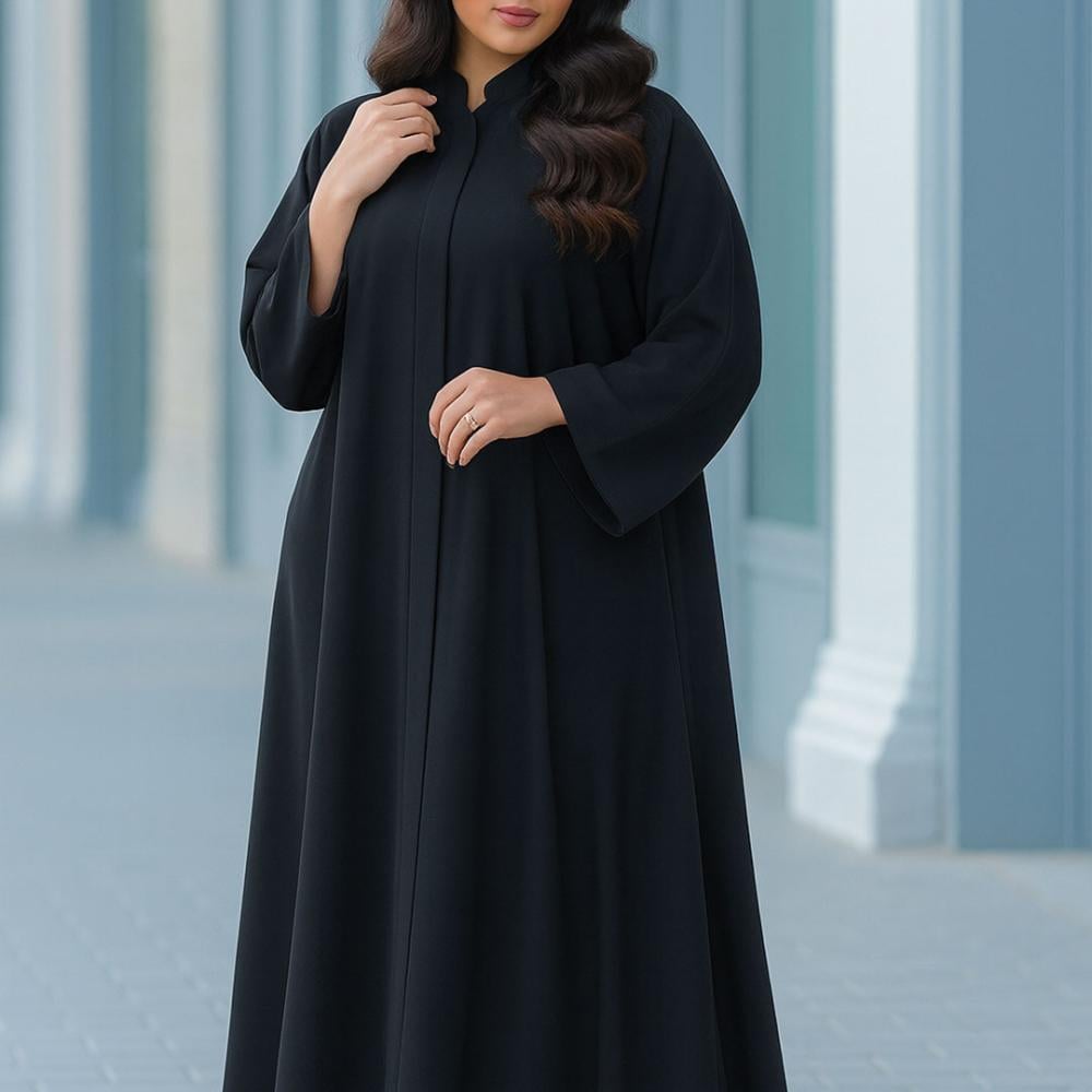 موديل ناعم اسود كامل بمقفلة بطق طق مخفيي مع ياقة والخامة عملية وباردة و لا تحتاج للكوي ومعها طرحة سادة بمقاس مترين 70x سم تقريبا بخامة الشيفون