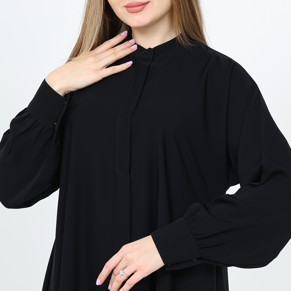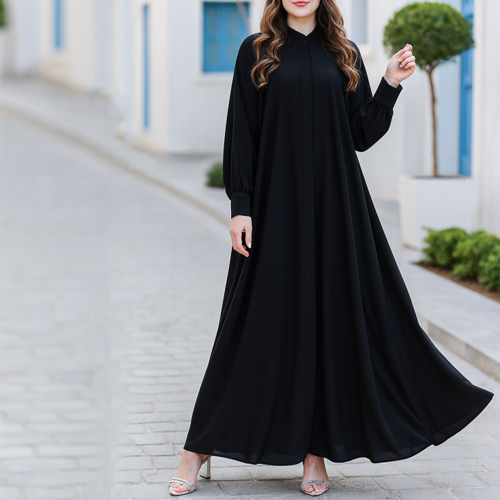 لا تحتاج للكوي وسوادها ممتاز موديل ناعم عملية ومعها طرحة بلون اسود مقاس مترين 70x سم تقريبا بخامة الشيفون