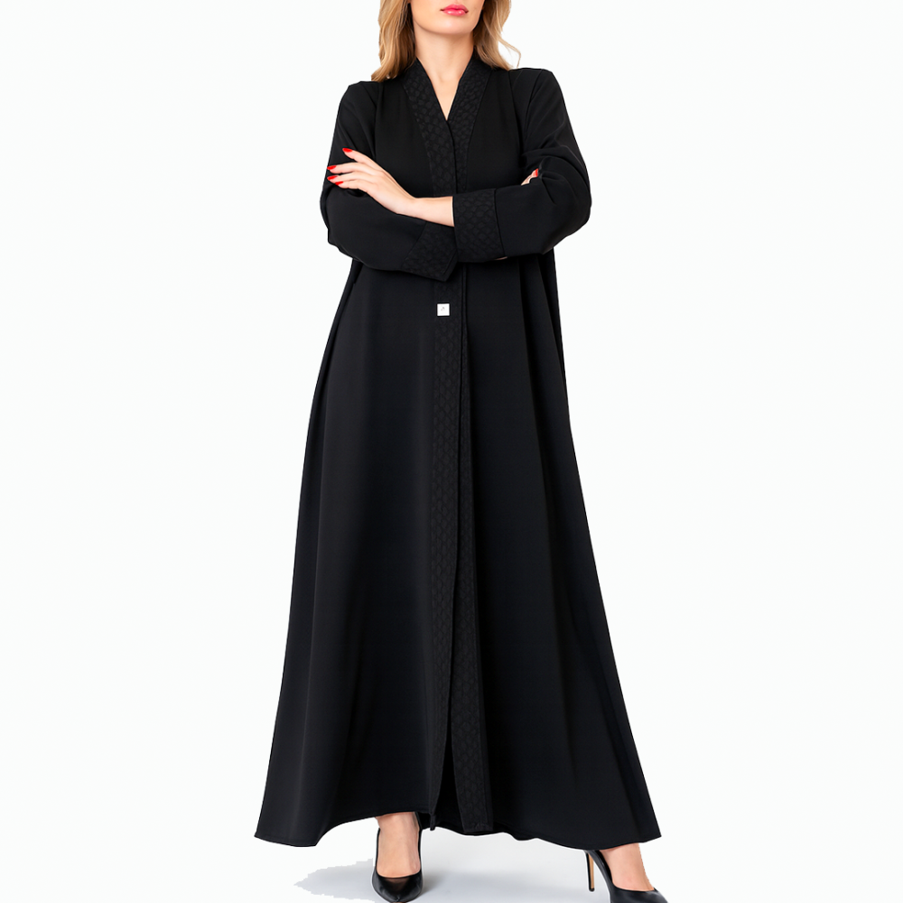 عباية موديها باطرافها فيها نعومة وعملية ولا تحتاج للكوي ومعها طرحة بلون اسود واطرافها فيها نفس قماش موديل العباية مقاس مترين 70x سم تقريبا بخامة الشيفون