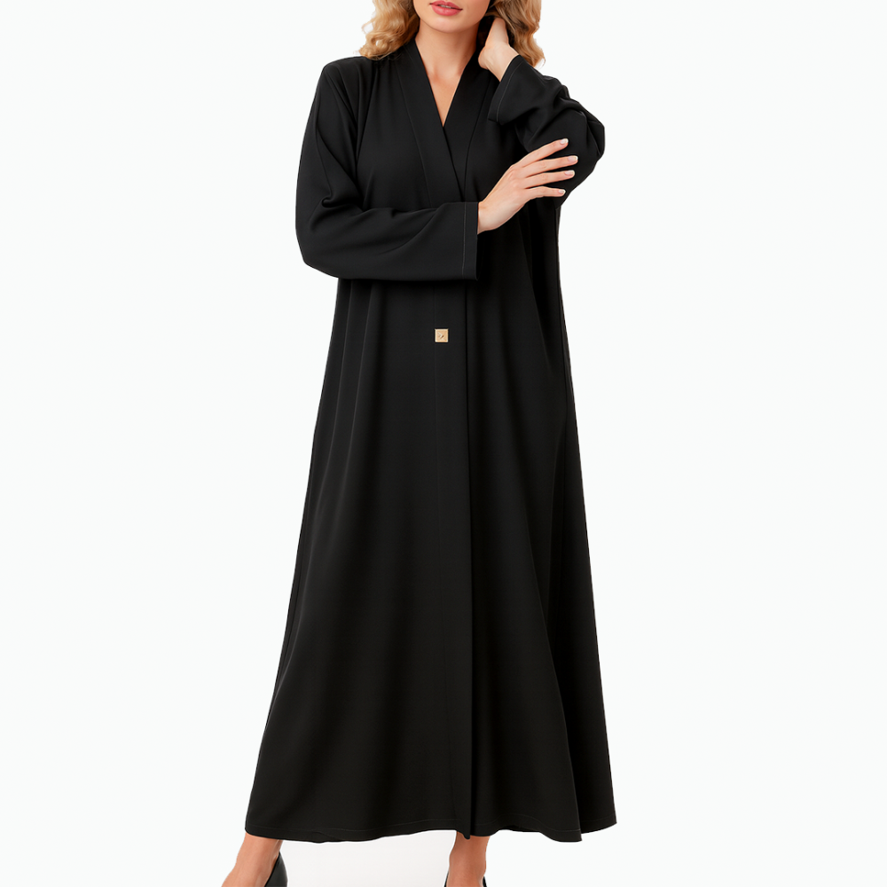 العباية من الخلف سادة ومعها طرحة بلون الاسود واطرافها بلون موديل العباية مقاس مترين 70x سم تقريبا بخامة الشيفون