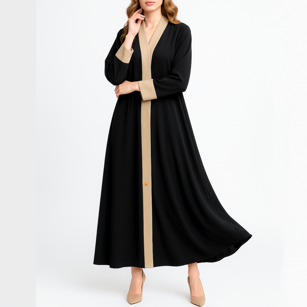 خامة باردة وخفيفة ولا تحتاج كوي تناسب اللبس اليومي ومعها طرحة بلون اسود واطرافها بلون موديل العباية مقاس مترين 70x سم تقريبا بخامة الشيفون