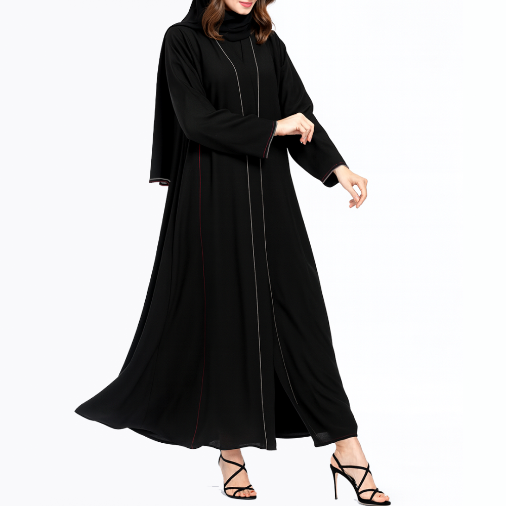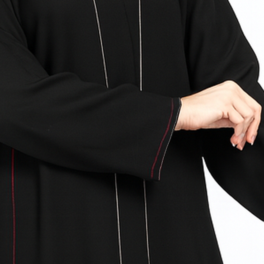 خامة ناعمة باردة لا تحتاج كوي تناسب الاستعمال اليومي والعباية مطرزة بالبيج والعودي الخط العودي ممتد لخلف العباية ايضا ومعها طرحة بلون اسود اطرافها مطرزة بالوان الموديل مقاس مترين 70x سم تقريبا بخامة الشيفون