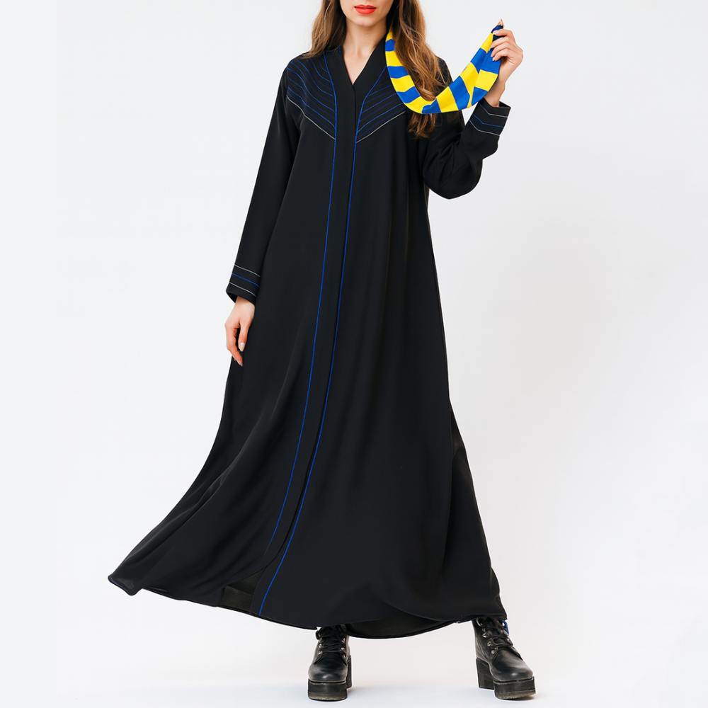 خامة ناعمة وباردة عملية لا تحتاج كوي والعباية من الخلف اسود سادة و معها طرحة بلون اسود واطرافها فيها تطريز متناسق مع العباية مقاس مترين 70x سم تقريبا بخامة الشيفون