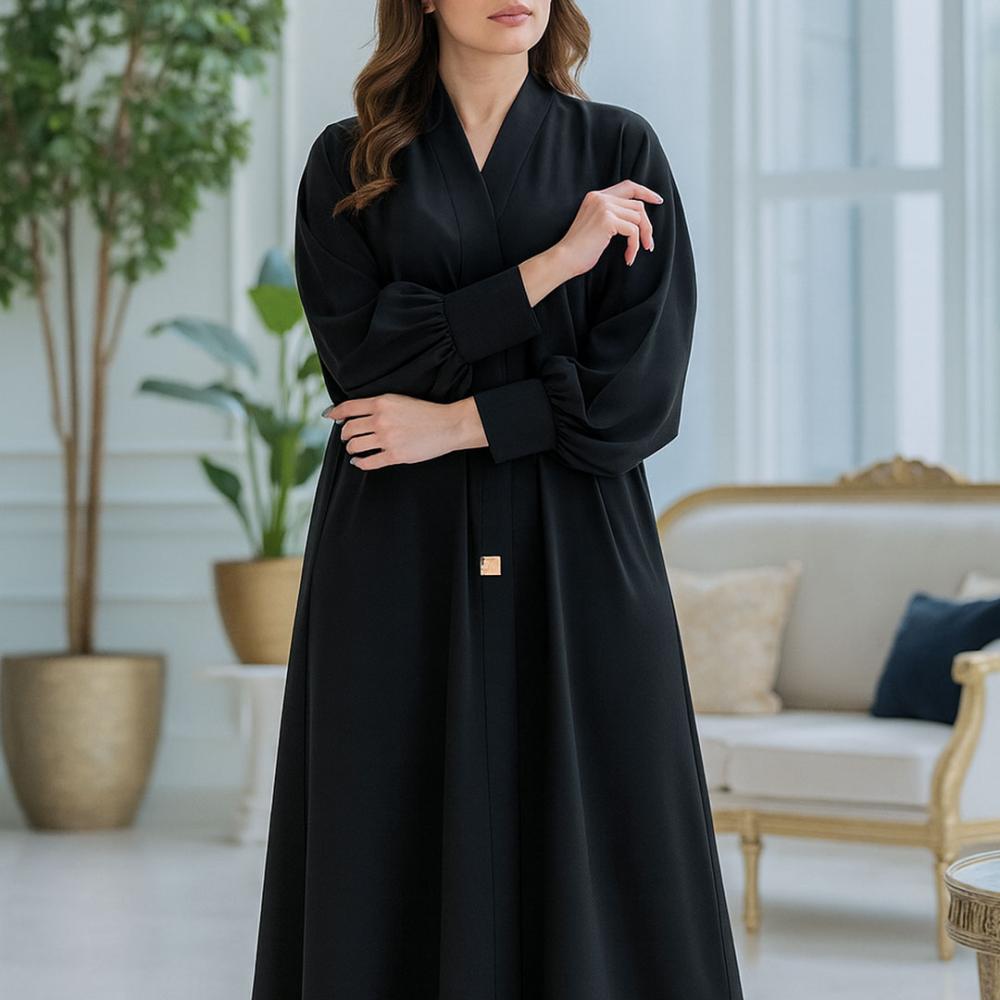 العباية ناعمة وعملية ونهاية الكم فيه طق طق والعباية مقفلة بطق طق مخفي ومعها طرحة سادة بمقاس مترين 70x سم تقريبا بخامة الشيفون