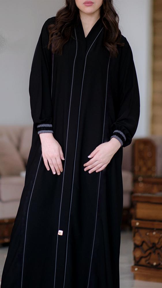 العباية من الخلف سادة ومعها طرحة بلون الاسود واطرافها بلون موديل العباية مقاس مترين 70x سم تقريبا بخامة الشيفون