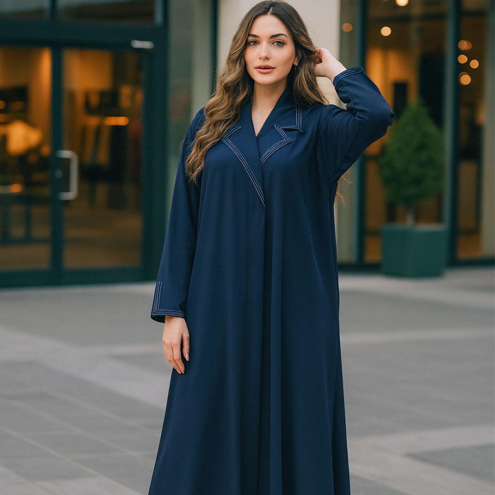 موديل ناعم مقفلة بطق طق مخفي خامة عملية لا تحتاج للكوي ولا تلتصق بالجسم ولا تجمع غبار ومعها طرحة من درجات الكحلي متناسقة مع الموديل مقاس مترين 70x سم تقريبا بخامة الشيفون