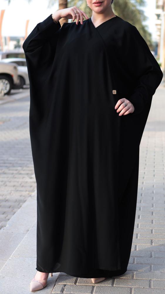 موديل ناعم بشت واسع وساتر خامة عملية لا تحتاج للكوي وفيها حزام داخلي مخفي لتثبيت الطرف الداخلي للعباية ومعها طرحة بلون اسود ساده مقاس مترين 70x سم تقريبا بخامة الشيفون
