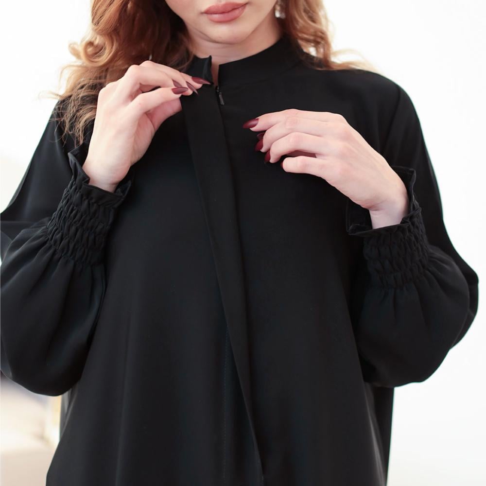 العباية ناعمة وواسعة وعملية فيها سحاب مخفي بالصدر فقط ومن الوسط واسفل مقفلة خياطة خامة باردة وناعمة ولا تحتاج كوي مناسبة للاستعمال اليومي ومعها طرحة متناسقة مع موديل العباية بمقاس مترين 70x سم تقريبا بخامة الشيفون