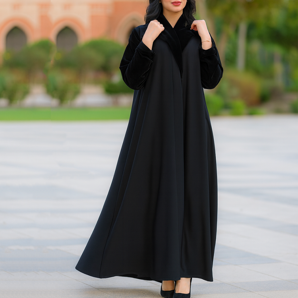 عباية عملية بأكمام وياقة مخمل اسود :