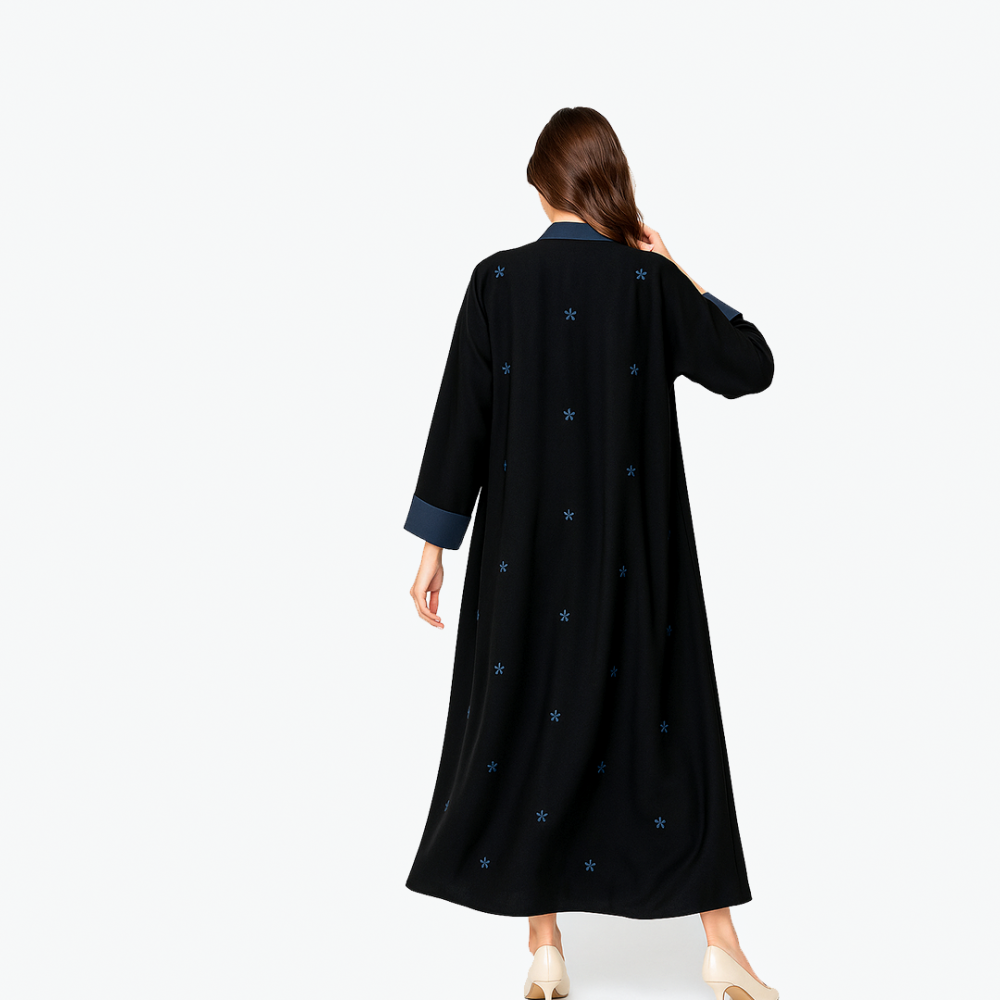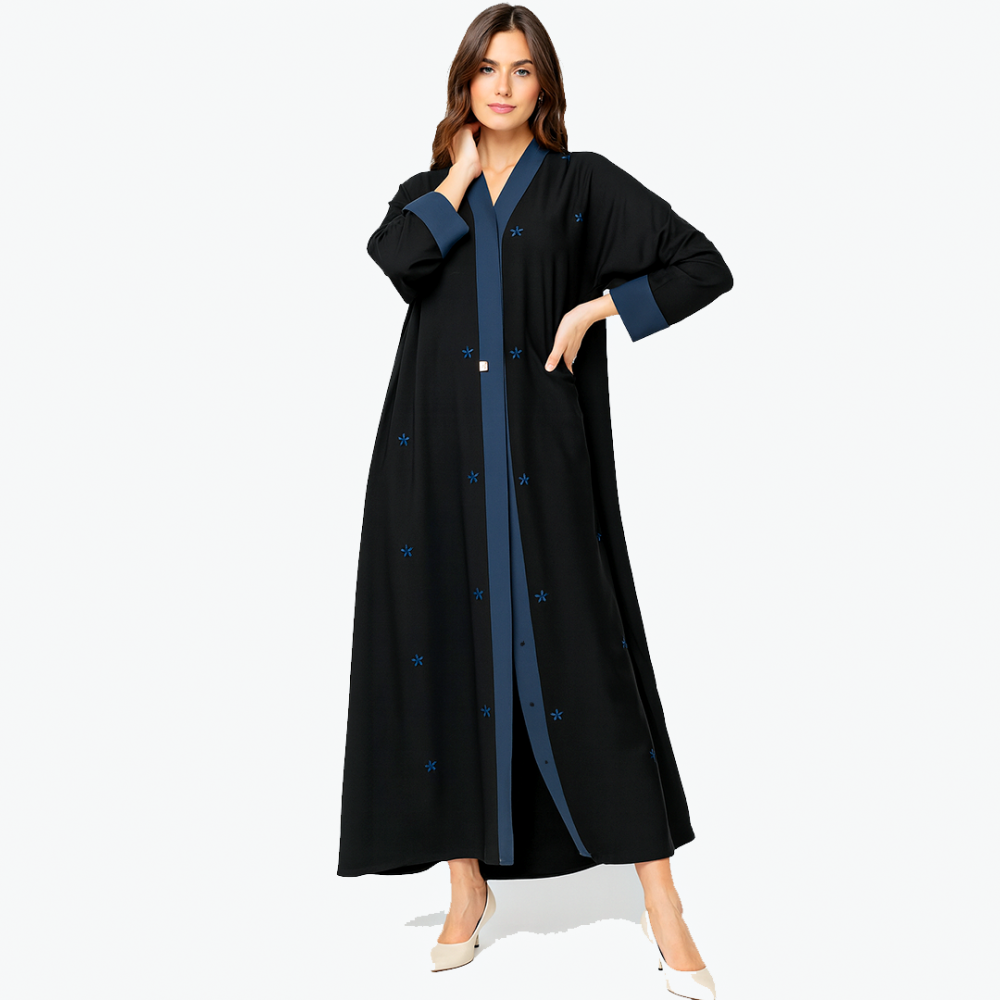 موديل ناعم مطرز بالكحلي اطراف العباية خامة الكتان وخامة العباية حرير ناعم بارد وعملية لا تحتاج للكوي وسوادها ممتاز موديل ناعم عملية ومعها طرحة متناسقة مع موديل العباية مقاس مترين 70x سم تقريبا بخامة الشيفون