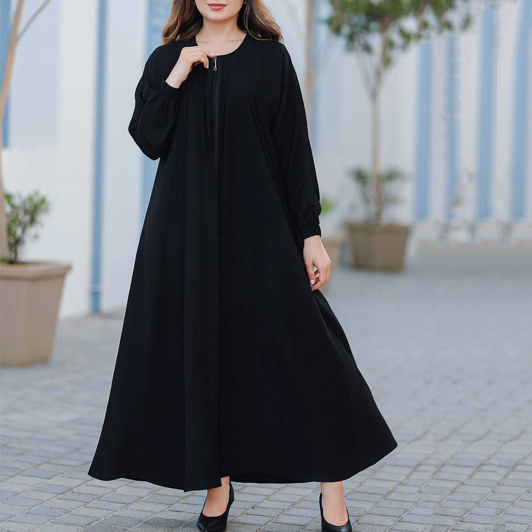خامة باردة وناعمة والموديل عملي بأكمام مطاط فيها سحاب مغطى لا تحتاج كوب وتناسب الاستعمال اليومي ومعها طرحة بلون اسود مقاس مترين 70x سم تقريبا بخامة الشيفون