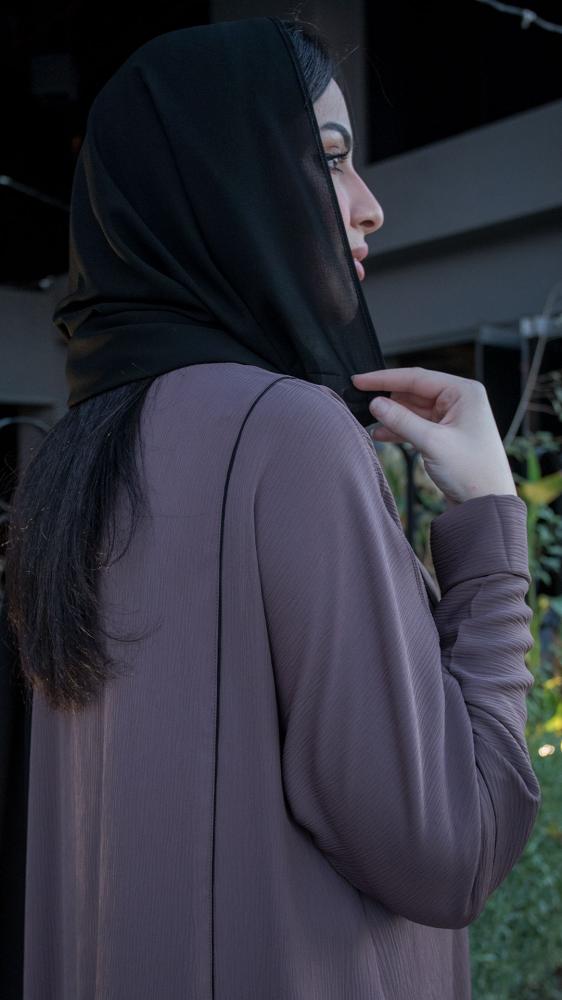 العباية ناعمة وعملية ولا تحتاج للكوي و معها طرحة بلون اسود اطرافها بلون موديل العباية مقاس مترين 70x سم تقريبا بخامة الشيفون