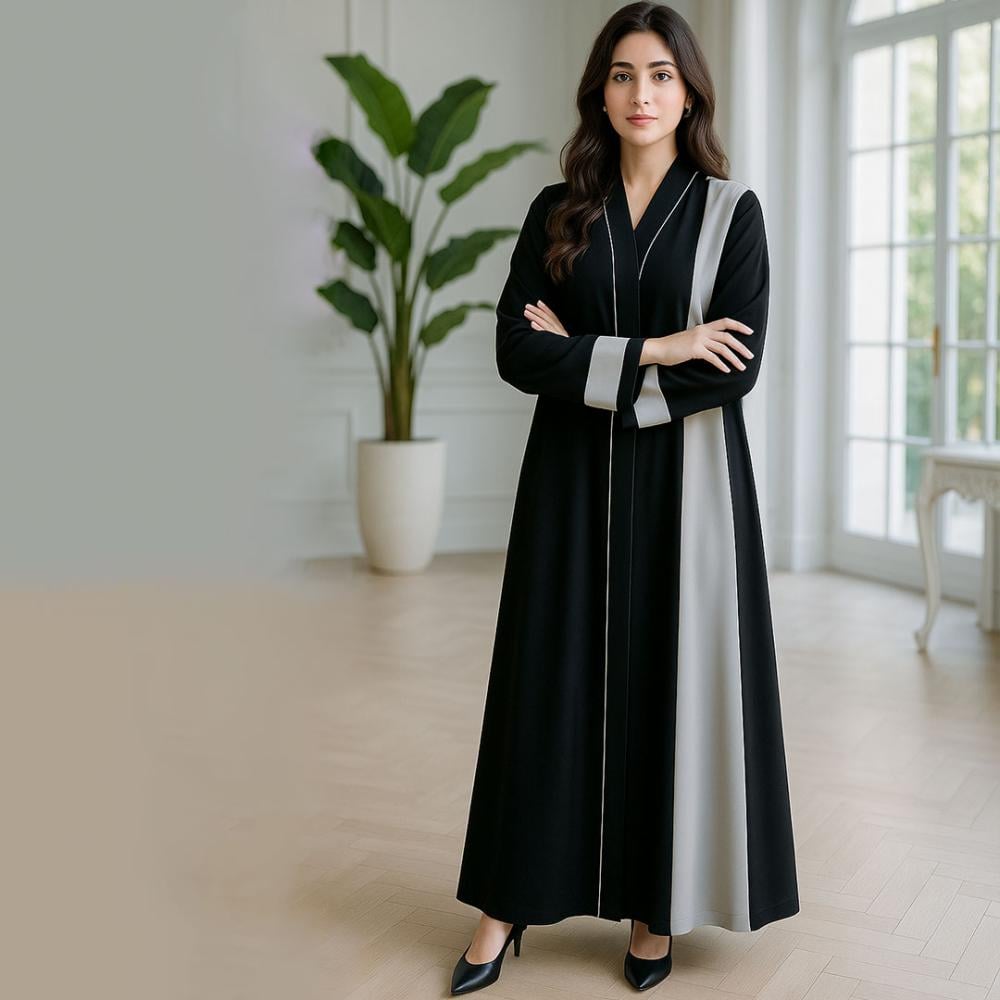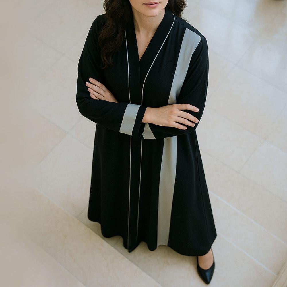 العباية من الخلف اسود كامل و معها طرحة بلون اسود واطرافها بلون موديل العباية مقاس مترين 70x سم تقريبا بخامة الشيفون