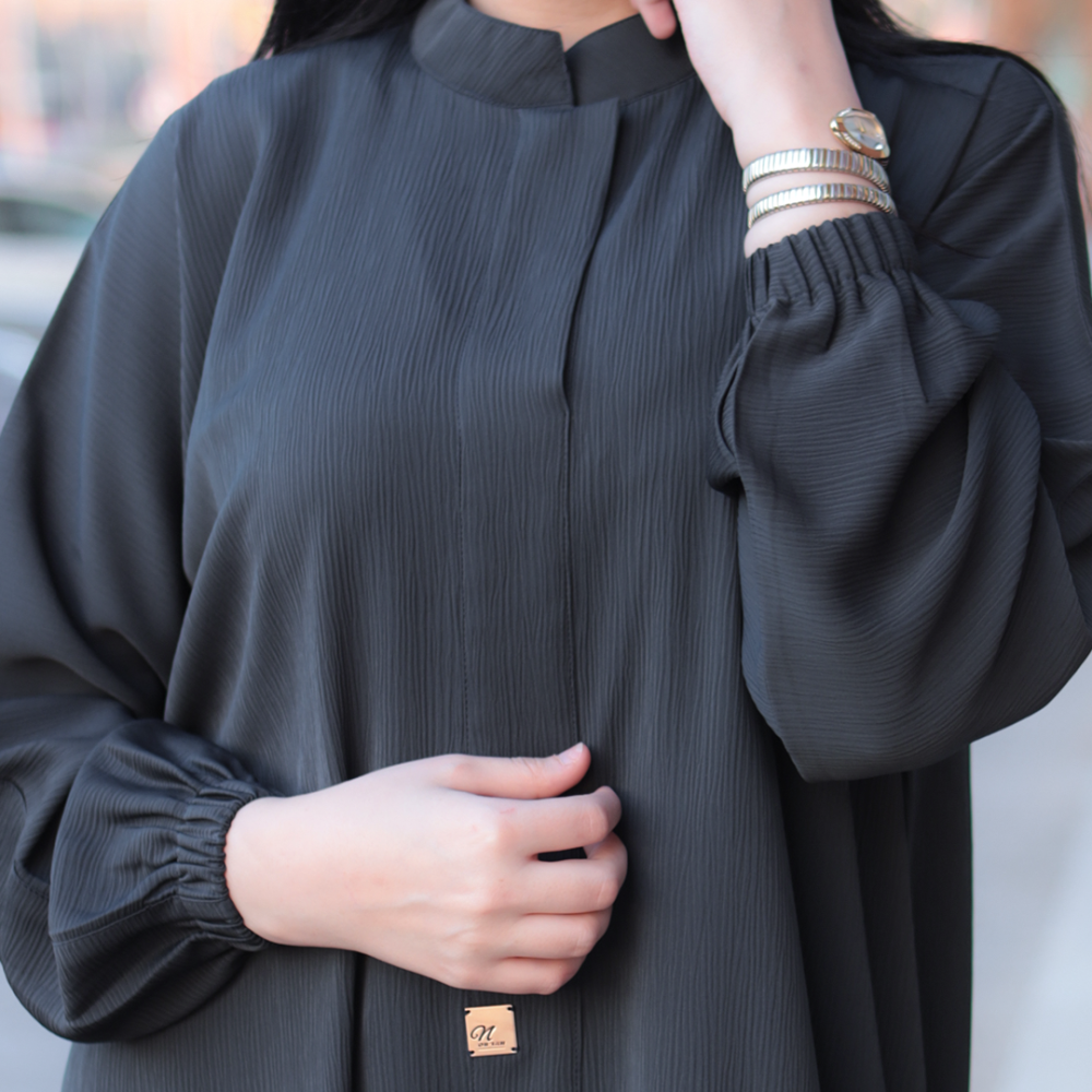 العباية ناعمة وعملية ولا تحتاج للكوي و معها طرحة بلون الرمادي الفاتح اطرافها بلون العباية مقاس مترين 70x سم تقريبا بخامة الشيفون
