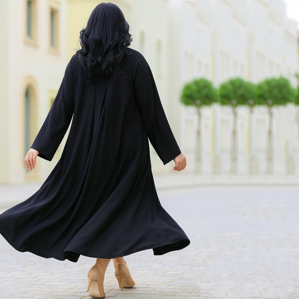 خامة باردة وخفيفة عملية لا تحتاج كوي تناسب اللبس اليومي موديل ناعم مقفلة من الأمام بتصميم كلوش ومعها طرحة مقاس مترين 70x سم تقريبا بخامة الشيفون