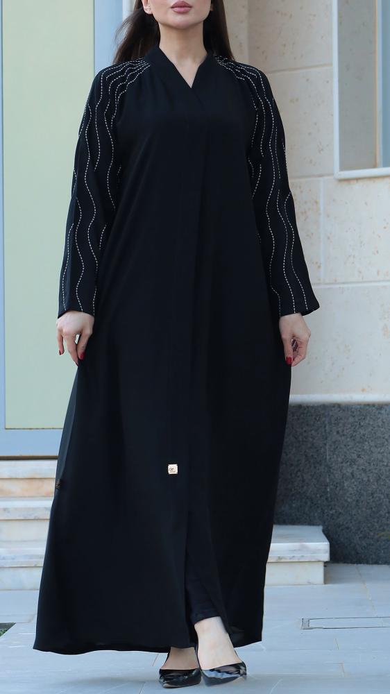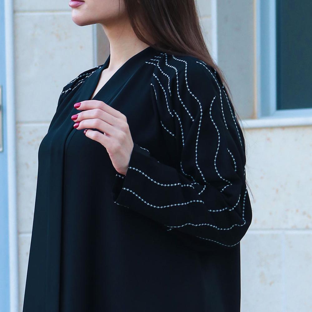 خامة عملية لا تحتاج للكوي وسوادها ممتاز موديل ناعم عملية ومعها طرحة متناسقة مع موديل العباية مقاس مترين 70x سم تقريبا بخامة الشيفون