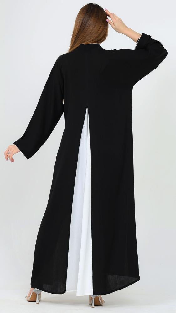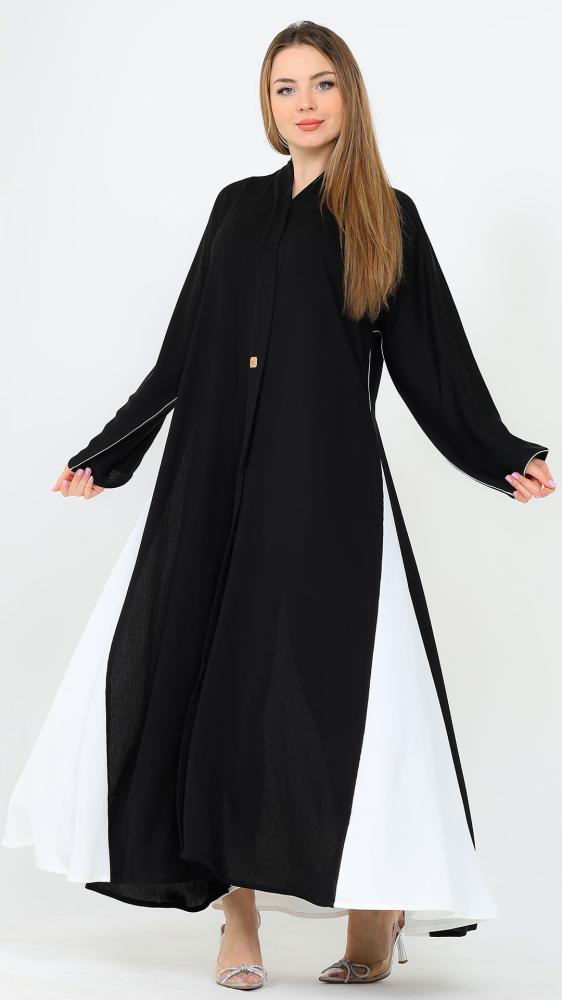 العباية ناعمة وعملية ولا تحتاج للكوي كلوش وفيها أكمام جانية طولية مخفية و معها طرحة بلون أسود مقاس مترين 70x سم تقريبا بخامة الشيفون