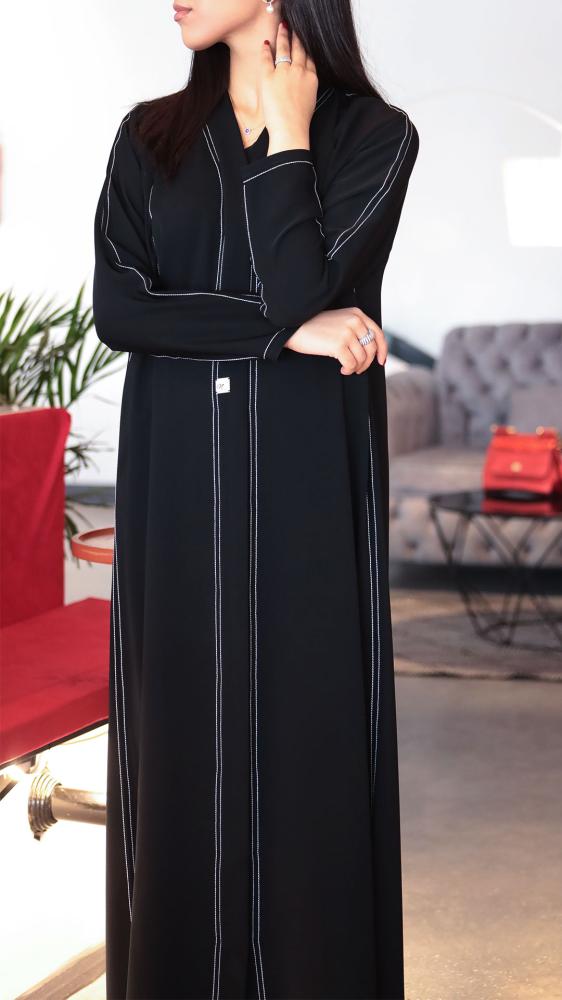 العباية من الخلف سادة و معها طرحة بلون اسود واطرافها فيها تطريز متناسق مع العباية مقاس مترين 70x سم تقريبا بخامة الشيفون