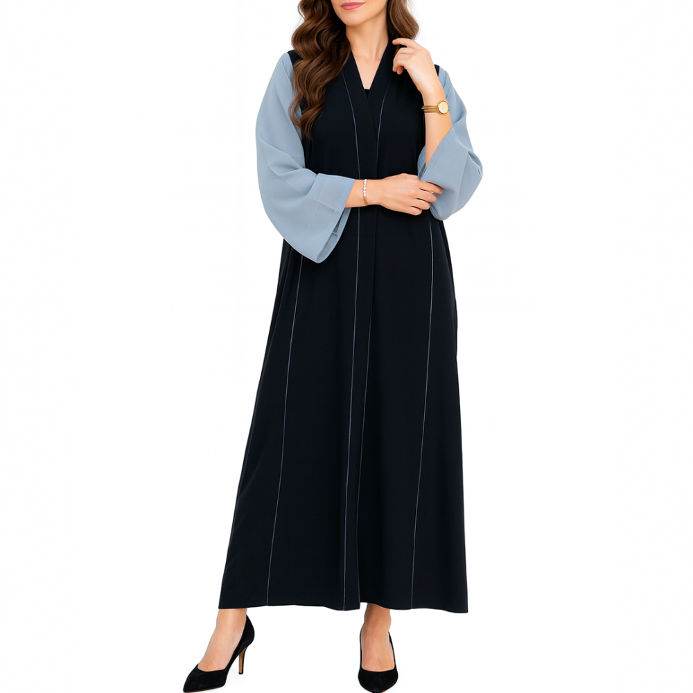 خامة باردة وناعمة وعملية تناسب الاستخدام اليومي والعباية من الخلف سادة ومعها طرحة بلون الاسود واطرافها بلون موديل العباية مقاس مترين 70x سم تقريبا بخامة الشيفون