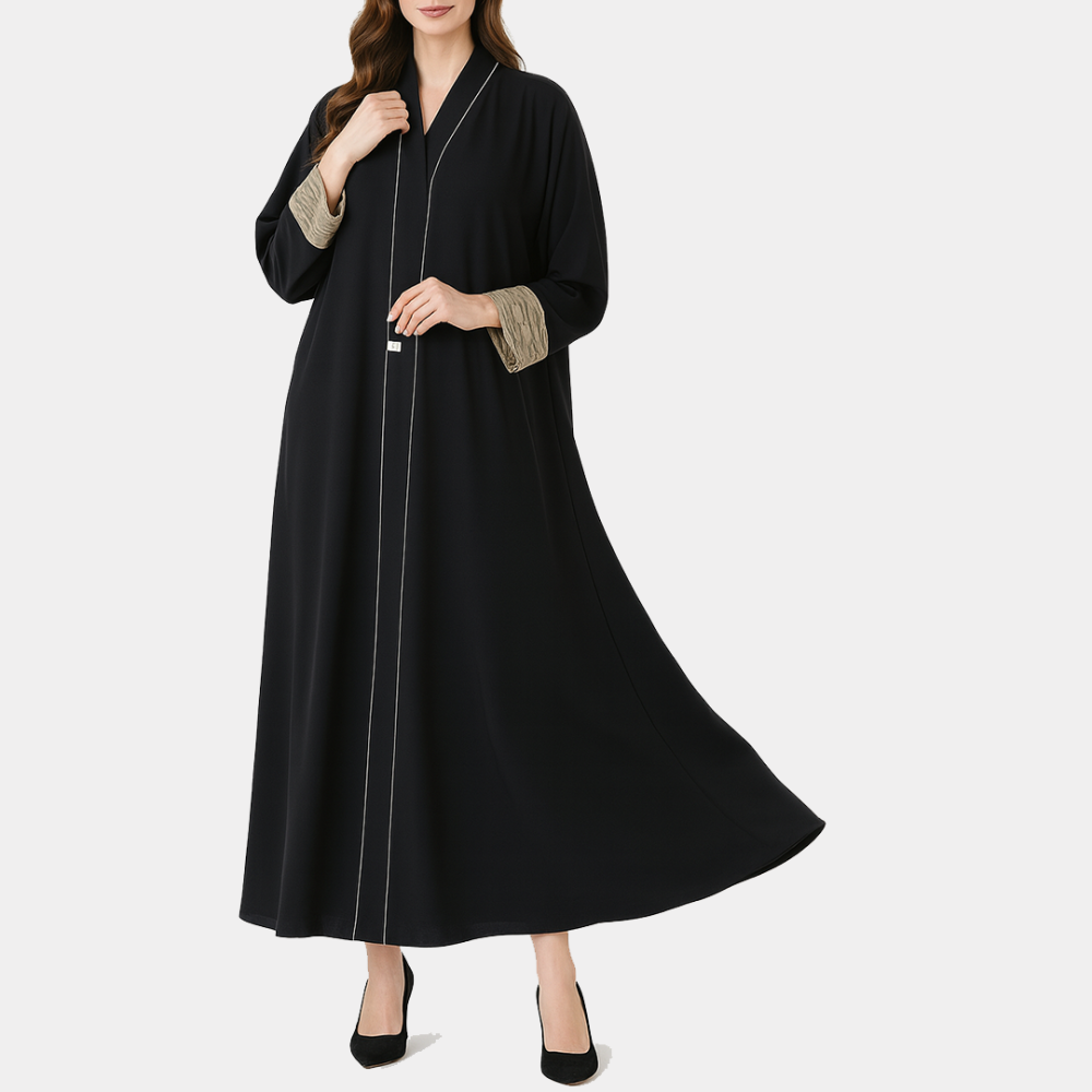موديل ناعم وعملي ولا تحتاج للكوي ومعها طرحة بلون الاسود واطرافها بلون موديل العباية مقاس مترين 70x سم تقريبا بخامة الشيفون